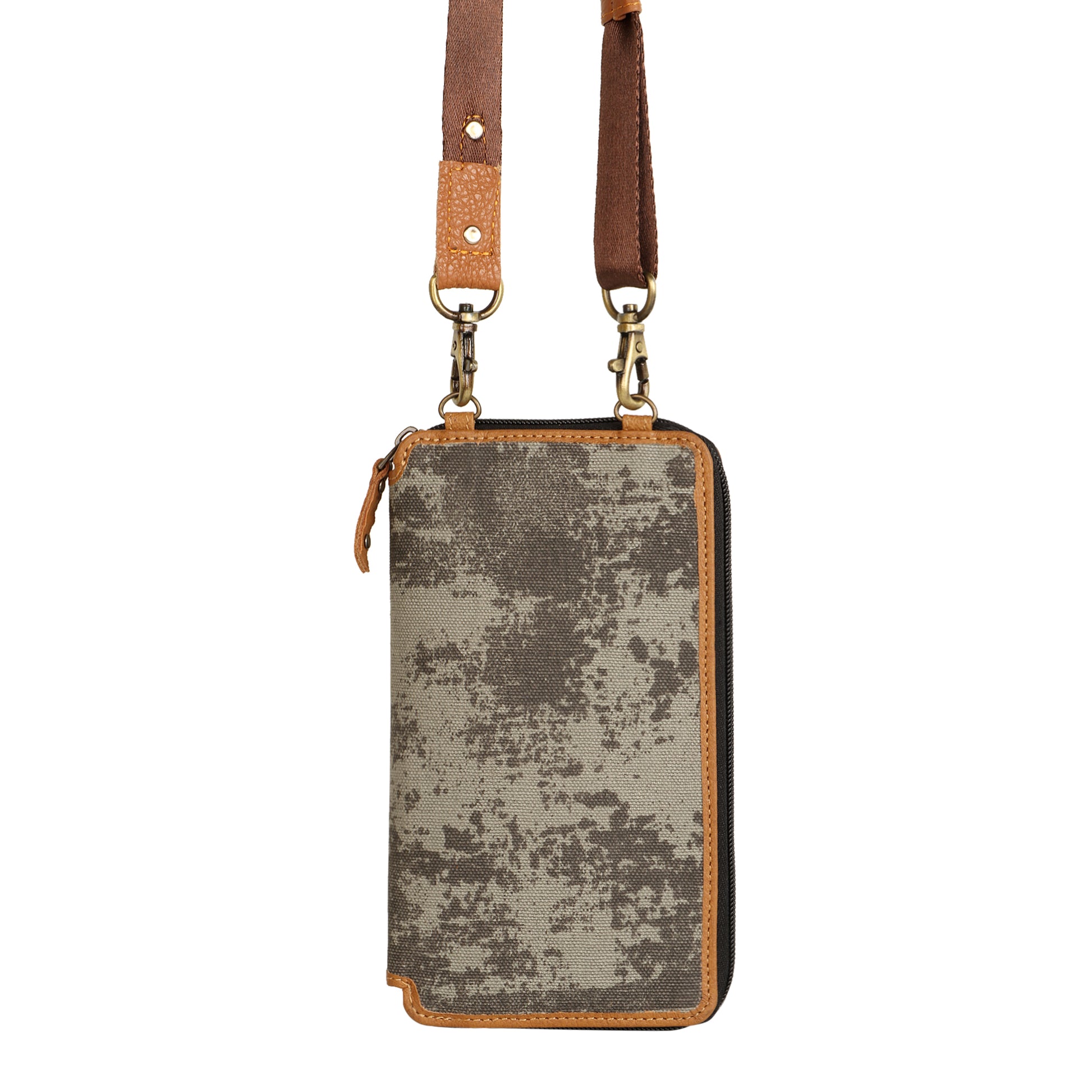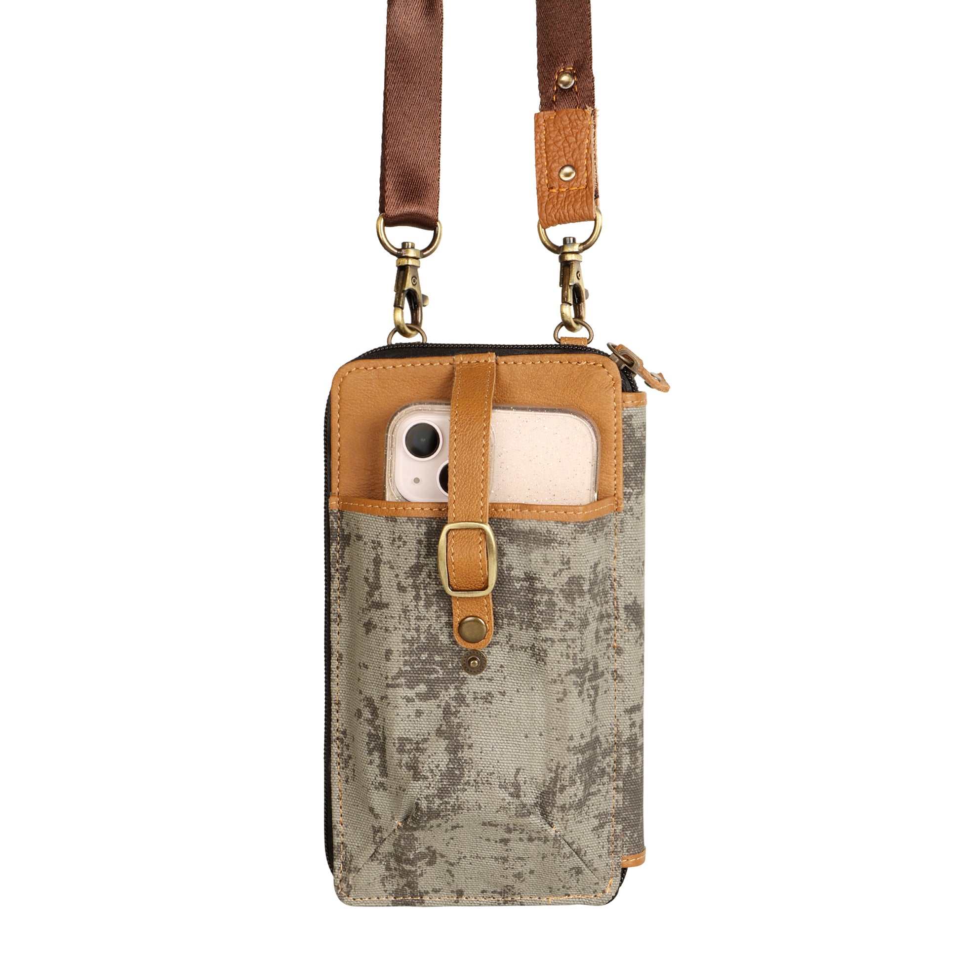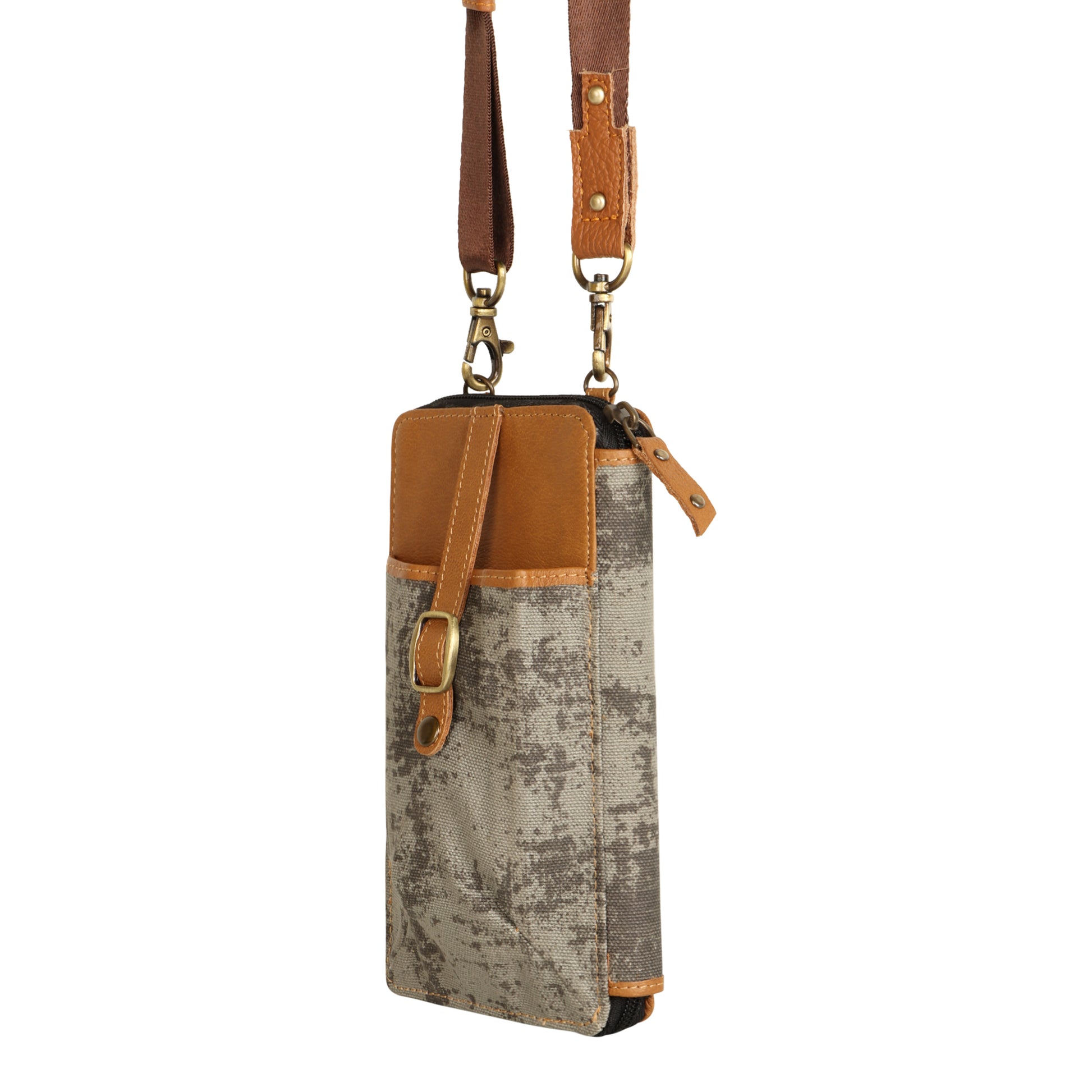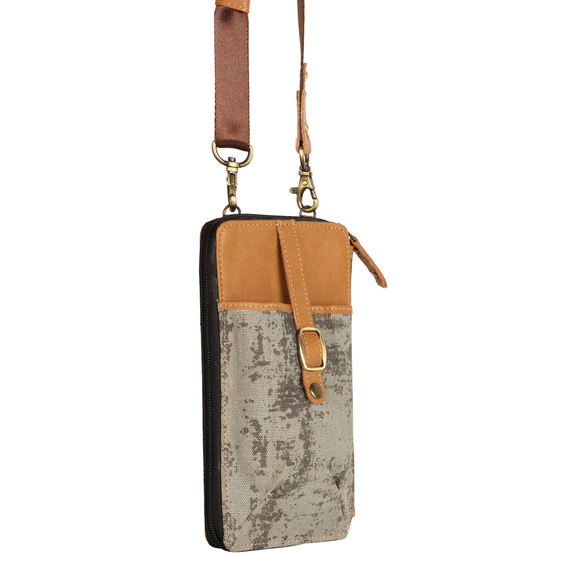 Perfect for a night on the town, this sustainable cellphone wallet holds your cards, cash, and phone in a lightweight, crossbody style. With plenty of card slots and a zippered pocket on the interior, and our signature upcycled leather and recycled canvas on the exterior, look no further for a simple, stylish new purse.